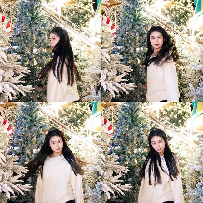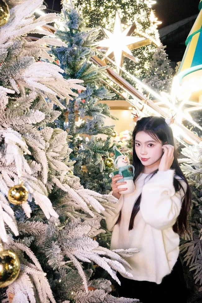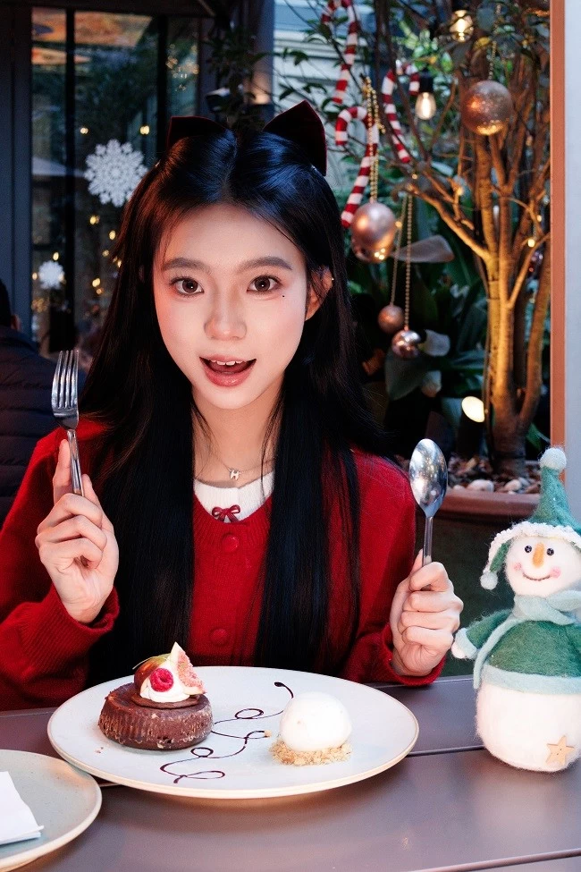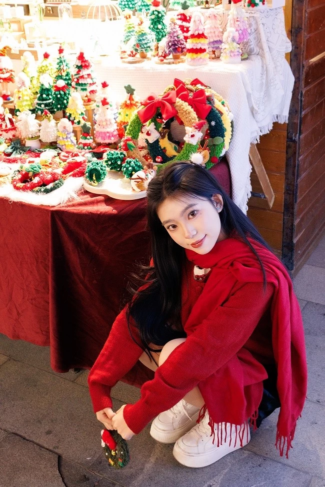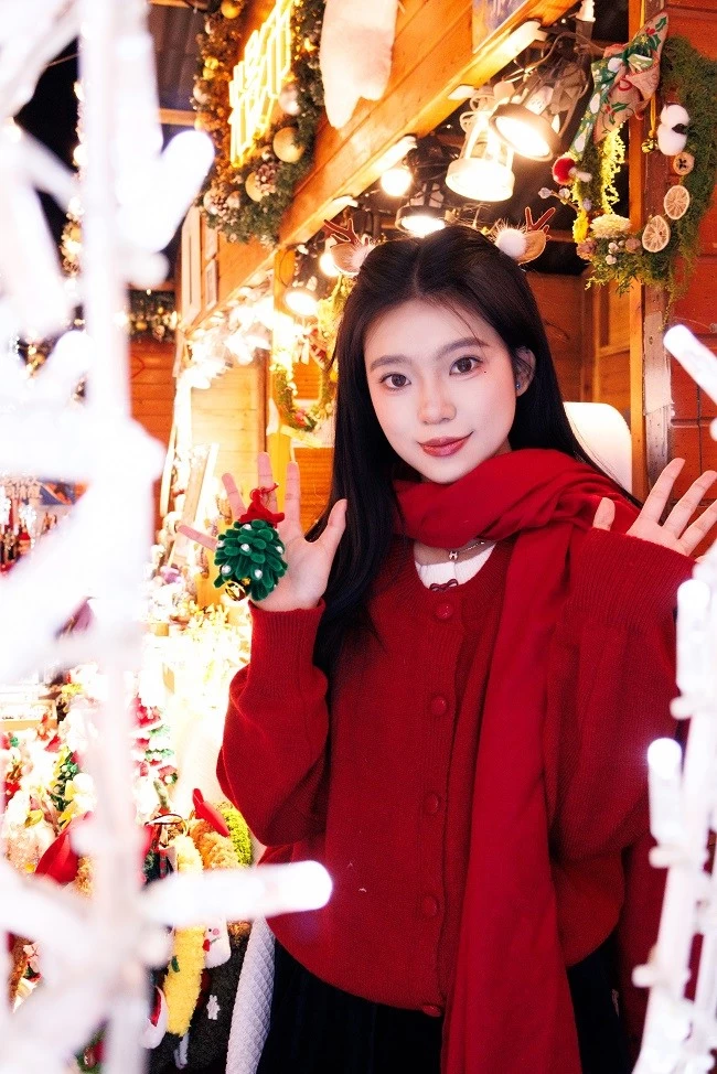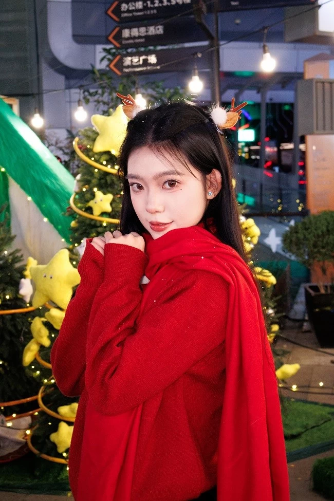 肤色呈现出自然的暖调红润感,搭配圣诞主题的红色毛衣,衣服的正红色和背景里彩色针织圣诞树的色彩层次分明,不用懂“色彩搭配”,R100 的色彩调校会帮你把人像和场景氛围完美融合。